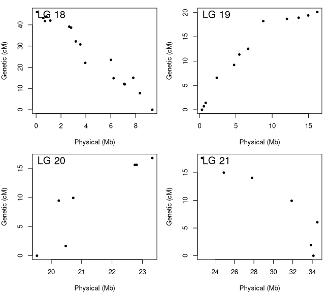 par(mfrow = c(2, 2), mar = c(4, 4, 1, 1))for (i in seq(18, 21)) { plot(physxcm[[i]]$physdist, physxcm[[i]]$cmdist, pch = 20, ylab = "Genetic (cM)", xlab = "Physical (Mb)") legend("topleft", paste("LG", as.character(i)), bty = "n", cex = 1.5, inset = -0.05)}