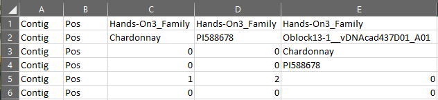The pedigree file that opens should have six rows and as many columns as taxa plus two (Figure 3). The first columns should appear as they do in Figure 3. A more complete breakdown of each row is covered in the Section 3 lecture. There are a few things we want to make sure are correct here. For the dataset provided with the hands-on, the parents are "PI588678" (seed parent) and "Chardonnay" (pollen parent) and they should be indicated as the female (2) and male (1) parents in row 5, respectively. Another thing to ensure is that the names of the parents given in row 2 of columns C and D match those given for every progeny in rows 3 and 4. Since our pedigree file is correct, we don't need to make any changes. If you aren't following along exactly or found an error, make sure you transfer the corrected file back to the BioHPC as we will need it and the imputed .vcf for 'Lep-MAP3'.