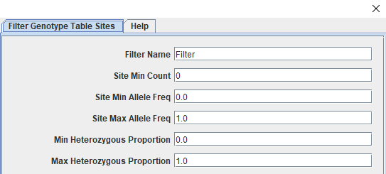 The following table presents the steps for filtering sites after you access the "Filter Genotype Table Sites" window, showing the arguments and the affect of each filter so you can follow along. I like to do them one at a time so I can keep track of how many sites are filtered at each step in case there are downstream issues.