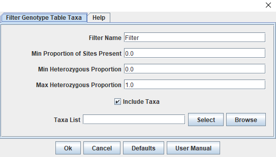 The genotype table should have 216 taxa and 1958 sites. These sites have had minimal filtering as part of the genotype calling step and need to filtered down to only those that are informative and high quality. We will start by splitting away the parent genotype calls before filtering the progeny for call rate (missingness), minor allele frequency, and polymorphic sites. Some additional filtering will occur later as we work through the 'Lep-MAP3' pipeline. Our last step before saving files will be to impute missing data using the LD-kNNi (Linkage Disequilibrium k-means Nearest Neighbor imputation) method described in Money et al., 2015 that has been incorporated in the Tassel software. The way filtering works in Tassel is through a specific window accessed by clicking "Filter" followed by "Filter Genotype Table Sites" (or "Filter Genotype Table Taxa") depending on our goals. The screenshots below shows the taxa filtering window (Figure 1) and the top section of the sites window (Figure 2).