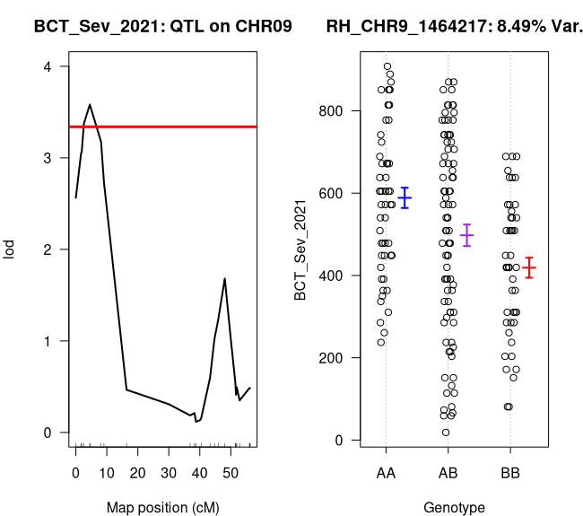 # Let's make a side-by-side plot of our qtl and it's effect plot (Figure 11)par(mfcol = c(1, 2), mar = c(4, 4, 3, 2))plot(sev_scan1, chr = 9, ylim = c(0, 4), main = "BCT_Sev_2021: QTL on CHR09")abline(h = as.numeric(summary(sev_scan1_perm))[2], col = "red", lw = 3)plotPXG(map, pheno.col = which(colnames(map$pheno) == "BCT_Sev_2021"), marker = "RH_CHR9_1464217", main = "RH_CHR9_1464217: 8.49% Var.")
