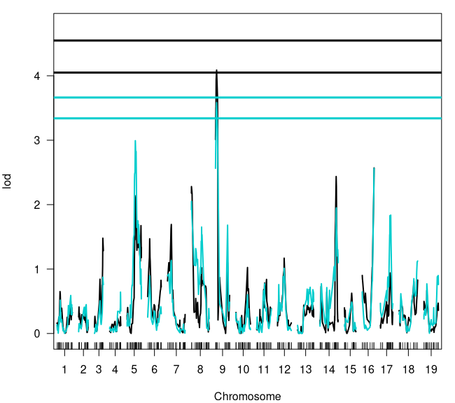 par(mfcol = c(1, 1), mar = c(4, 4, 1, 1))# Plots both qtl models where cim is black; scanone is blueplot(sev_cim, sev_scan1, col = c("black", "cyan3"), ylim = c(-0.05, (max(sev_scan1[ , 3], sev_cim[, 3], as.numeric(summary(sev_cim_perm)), as.numeric(summary(sev_scan1_perm))) * 1.05)))# Add the 5% LOD threshold for both models; color matchedabline(h = c(as.numeric(summary(sev_cim_perm))[1], as.numeric(summary(sev_scan1_perm))[1]), col = c("black", "cyan3"), lw = 3)# Add the 10% LOD threshold for both models; color matchedabline(h = c(as.numeric(summary(sev_cim_perm))[2], as.numeric(summary(sev_scan1_perm))[2]), col = c("black", "cyan3"), lw = 3)