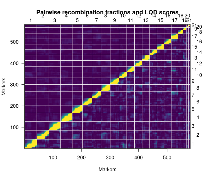 The recombination frequency plot shows the pairwise LOD scores for linkage and recombination frequencies of every marker in the linkage map. The ideal plot will be brightest along the diagonal.